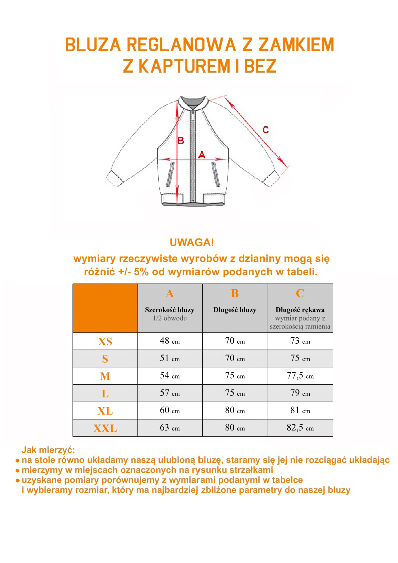 Rozmiary od XS do XXL (tabelka z wymiarami bluzy jest w sekcji zdjęcia).