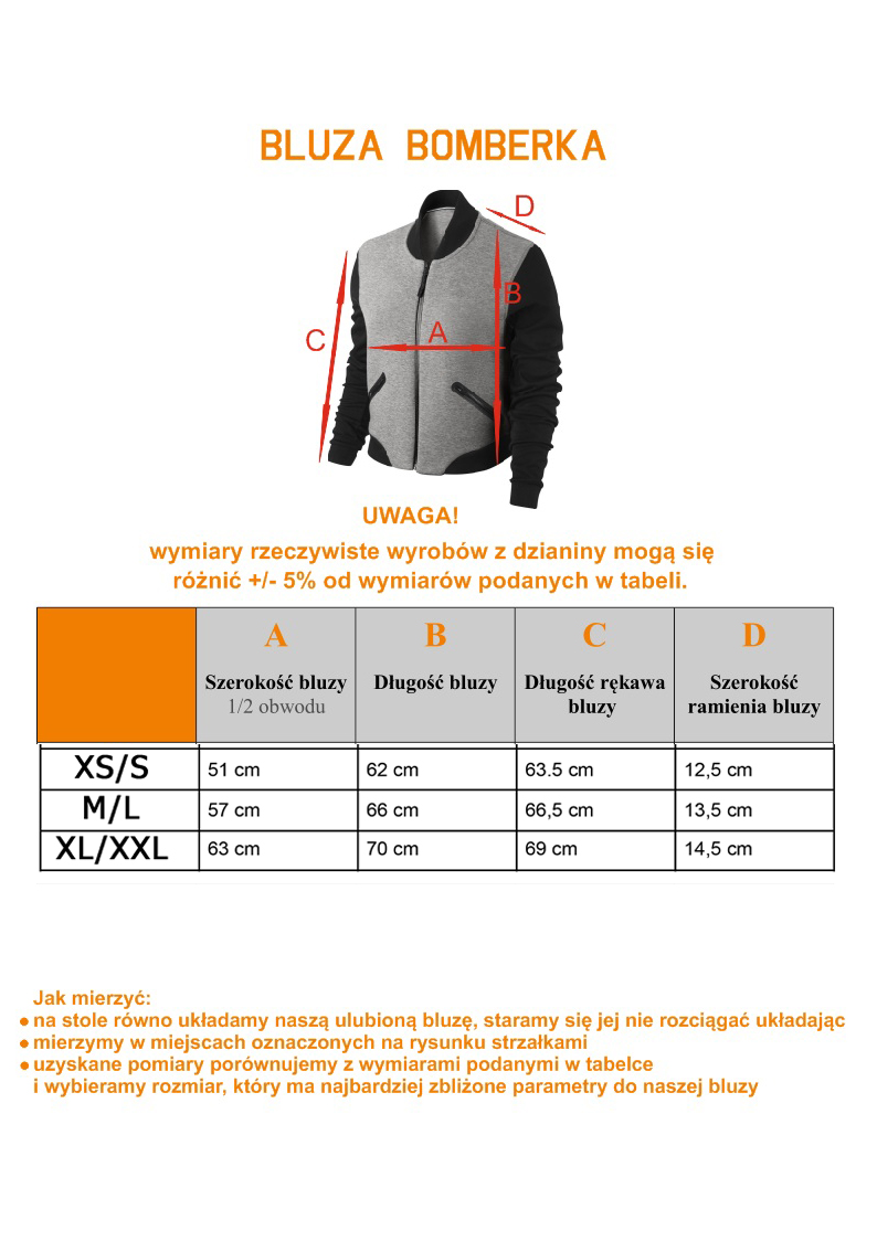Rozmiary od XS do XXL – tabela z wymiarami bluz w sekcji zdjęcia. Z uwagi na to, że bluzy szyte są z dzianiny może wystąpić różnica pomiędzy podanymi wymiarami a rzeczywistością +/- 2-3 cm.