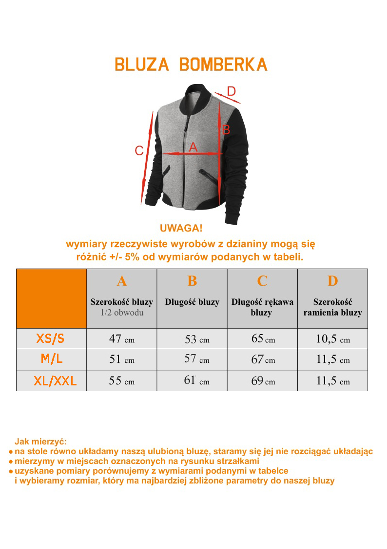 Rozmiary od XS do XXL – tabela z wymiarami bluz w sekcji zdjęcia. Z uwagi na to, że bluzy szyte są z dzianiny może wystąpić różnica pomiędzy podanymi wymiarami a rzeczywistością +/- 2-3 cm.
