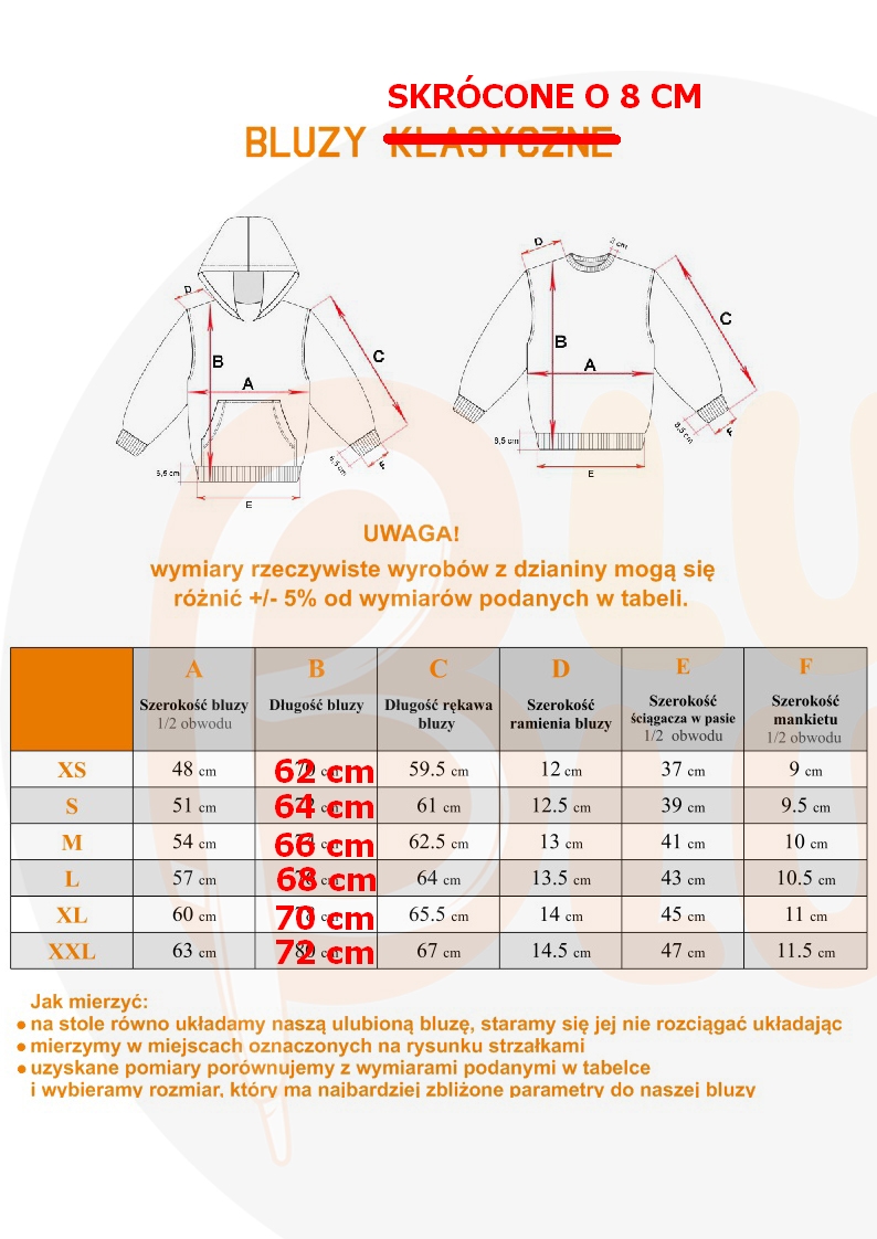 Rozmiary – tabela z wymiarami bluz w sekcji zdjęcia. Z uwagi na to, że bluzy szyte są z dzianiny może wystąpić różnica pomiędzy podanymi wymiarami a rzeczywistością +/- 2-3 cm.