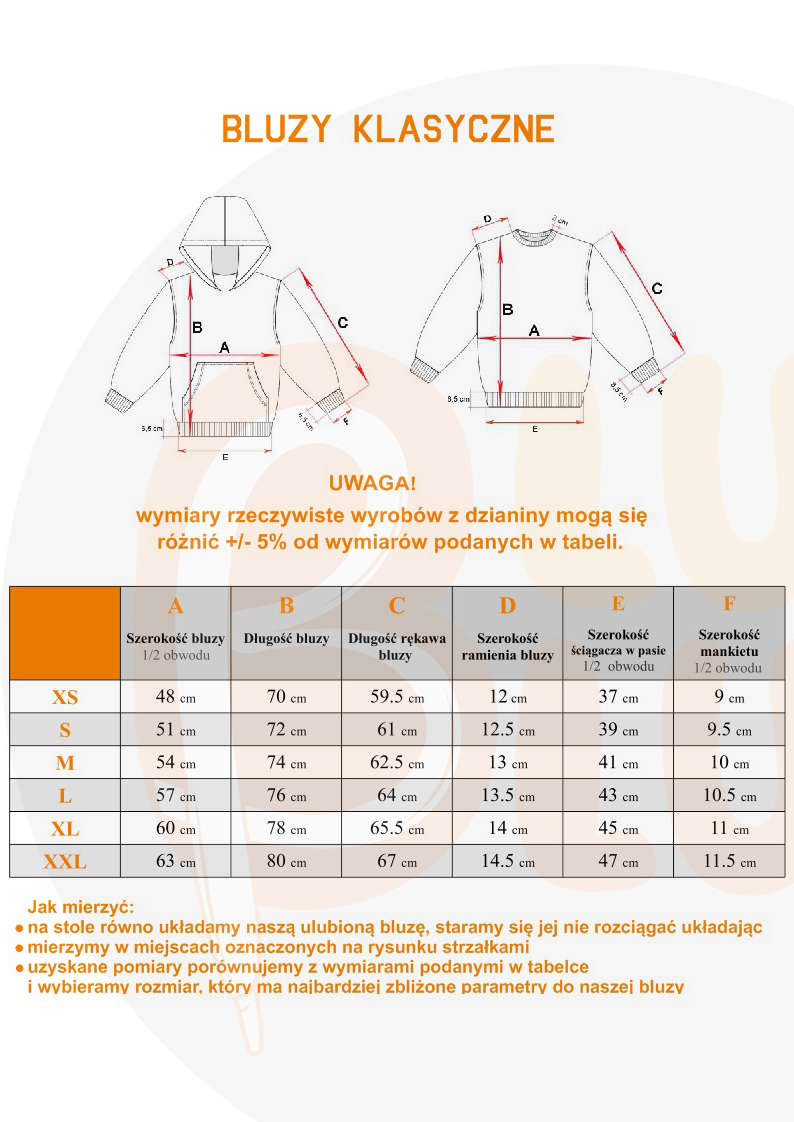 Rozmiary – tabela z wymiarami bluz w sekcji zdjęcia. Z uwagi na to, że bluzy szyte są z dzianiny może wystąpić różnica pomiędzy podanymi wymiarami a rzeczywistością +/- 2-3 cm.
