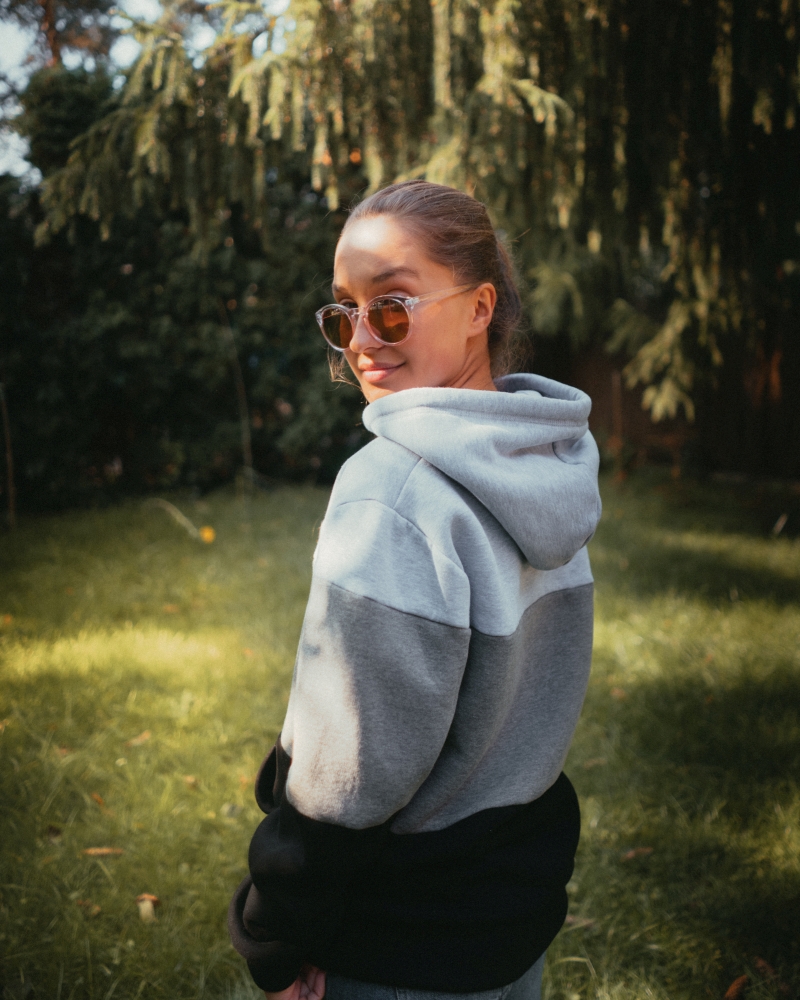 Uwaga! do pierwszego prania ubranie noszone pod bluzą może obłazić meszkiem w kolorze bluzy. Jest to pozostałość po technologicznej obróbce lewej strony dzianiny. Zalecamy uprać przed założeniem.